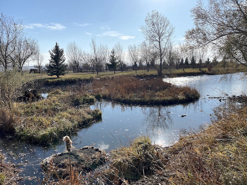 Bruce Kania: Yeah, the red dog story. Actually the dog was black. His name is Rufus. Here is Rufus, he was two years old. The dog had charisma. He’s one of those dogs that people come over here to see Bruce, but I think they really came over to connect with Rufus, an awesome pup. I had purchased this particular farm, a few 100 acres, and immediately put a pond in because I wanted to invent and work around water and agriculture, where they connect with the interface. I put this pond in using ditch water from a local irrigation ditch. Late that summer, Rufus is out there swimming in his pond and he comes back to the shore, shakes himself off, and within a few minutes his black dog hair takes on a reddish hue.